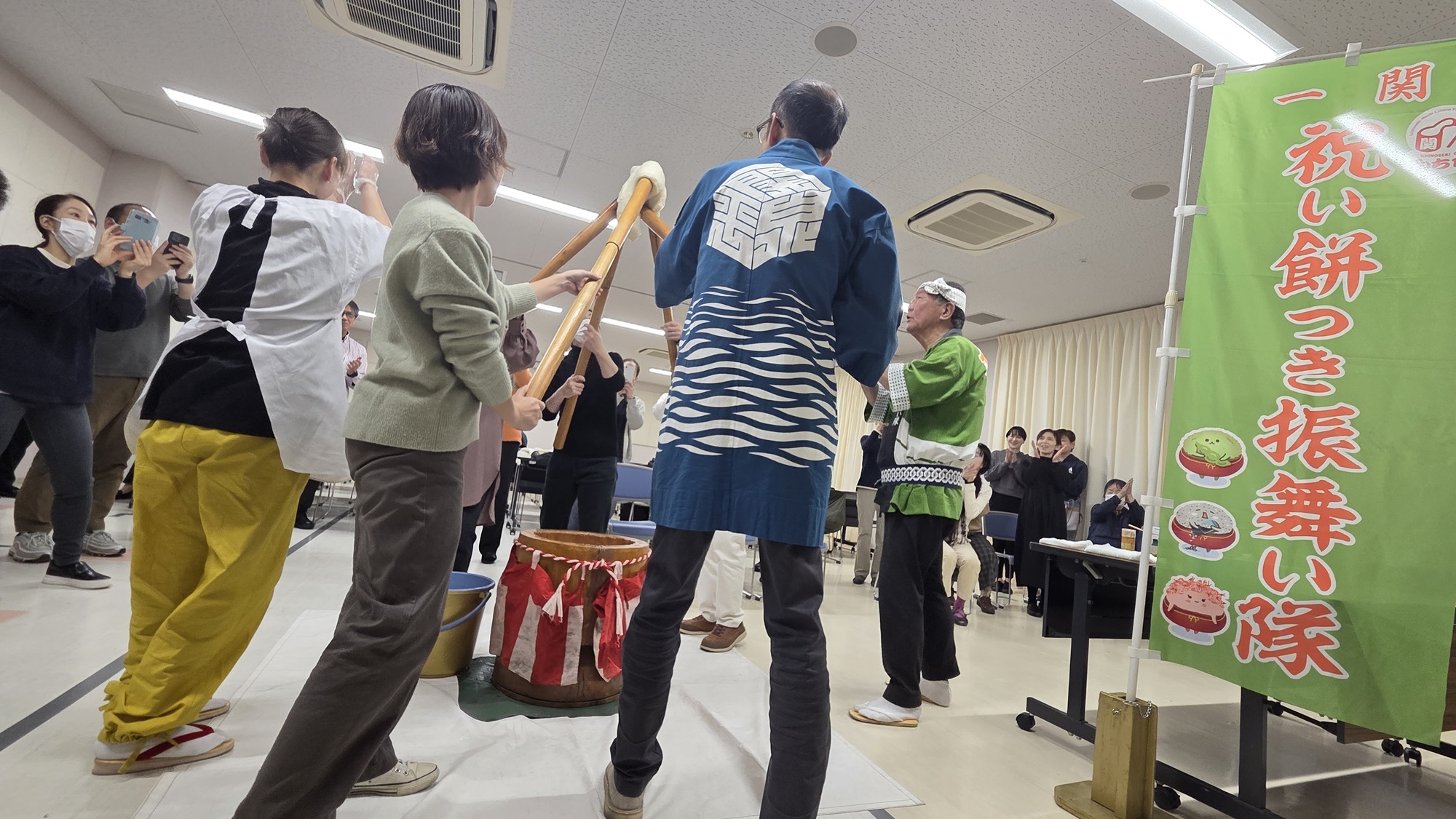 検定終了後は、祝いもちつき振舞い隊によるもちつき体験を行い、唄とともに賑やかにもちつきを楽しんでいただいたほか、ねぎ醤油もちを味わっていただきました。